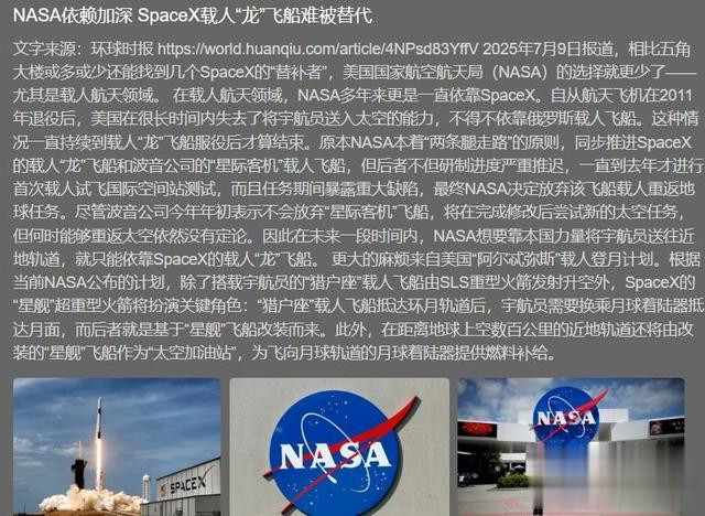 结果就是:NASA 依赖马斯克的 SpaceX 公司开展航天任务,却因星舰项目进展迟缓等问题,导致 “阿尔忒弥斯” 载人登月计划屡次延期。